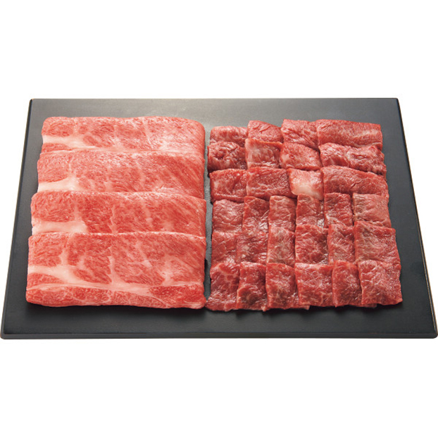 32カ月以上の肥育と雌限定のこだわり抜いた芸術品、米沢牛。この米沢牛のバラ肉と赤身肉を焼肉で。肩ロース肉をすき焼でお届けします。